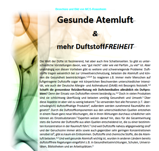 Broschüre: "Gesunde Atemluft & mehr Duftstofffreiheit von MCS-Rosenheim: https://mcs-rosenheim.de/wp-content/uploads/Gesunde_Atemluft_und_Duftstofffreiheit.pdf