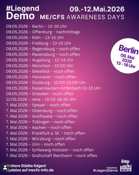 👉Am 12. Mai 2026 ist wieder der internationale ME/CFS Awareness Day, deshalb finden zu diesem Anlass wieder LiegendDemos in vielen Städten statt!